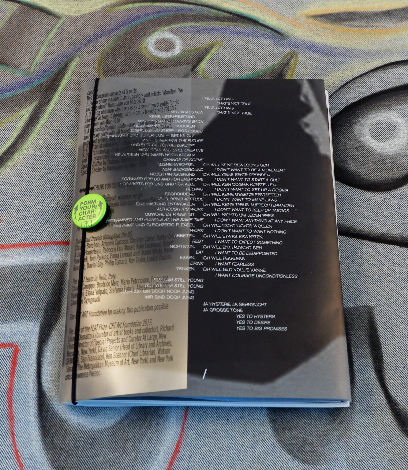 Form your Character, Hammann von Mier’s most recent artist’s book, contextualizes and presents their collaborative work as artists and publishers. Reflections on their own practice are linked, specified and explored with materials from extended visits in the USA – in particular a two-month research stay in New York, 2018. The publication concentrates on two central themes: the interrogation of the possibilities and conditions of being an artist (focusing on “”survival strategies”” outside of the art market), and the relationship between artistic work and politics considered via self-positioning to current events in New York and Munich. The resulting artist’s book consists of five diverse parts and is based on elements of the Zine culture. Form your Character! was made possible by the FLAT Preis-CRT Art Foundation 2017, Turin, Italy.
